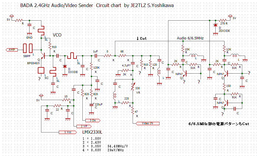 FM送信機に使った、BADA製Audio/Video Senderから読み取って調べた回路図です。