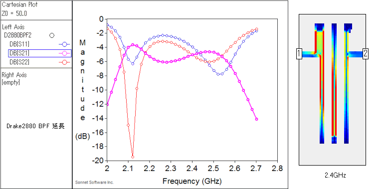 特性はあまり変わらないと思う予想に反し、2500MHz付近が落ちるし発振のようなピークが出てきてビックリ!。