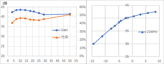 効率は出力が増えるほどよくなるが、10Wを超えると直線性が悪化している。