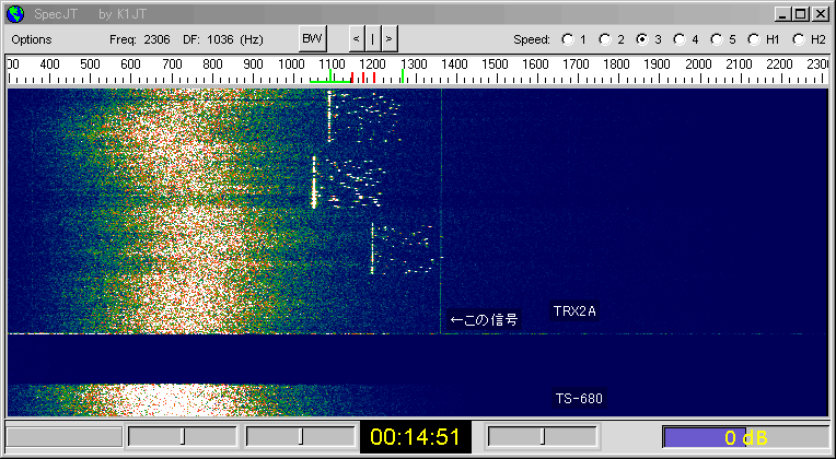 TRX2Aに切り替えたら1360Hzに弱い信号がしっかり見えている。
