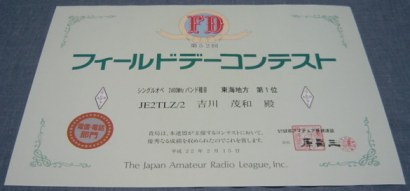 いまごろだが、JARLnewsをよく見たら、フィールドデーに入賞していた。