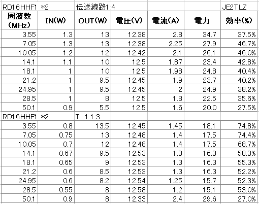 | f MHz | Out W | A | in W | % | Gain 倍 | Out W | A | in W | % | Gain 倍 | |