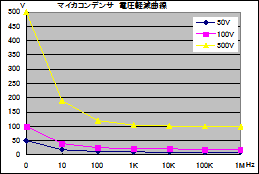 周波数が上がると耐圧が下がり、HF帯では約2割になる。 MicaCapacitor_V.png