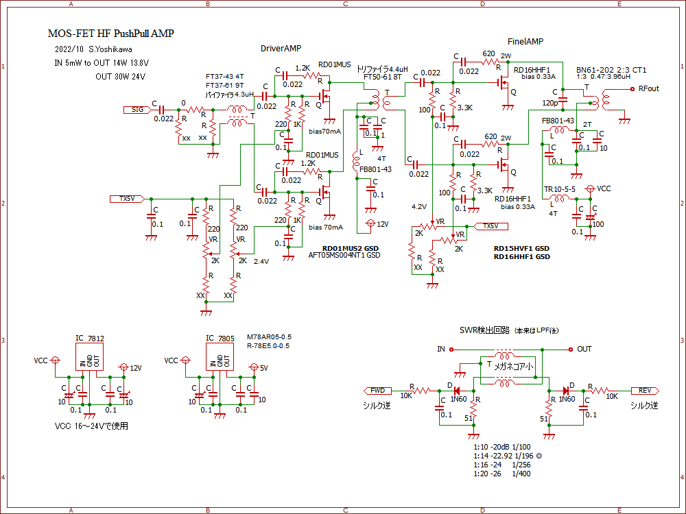 終段をRD16HHF1x2としVCC=24Vにすると30W出る。(HF)