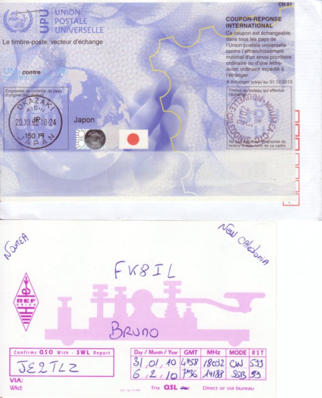 なんと切手の代わりにIRCが貼られて来た。カードも手書き(^-^) → SASE着 FK8IL